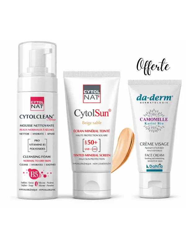 CYTOLNAT - MOUSSE NETTOYANTE PEAUX NORMALES A SECHES + ECRAN TEINTE BEIGE SABLE SPF50+ + DADERM CREME MAINS OFFERTE