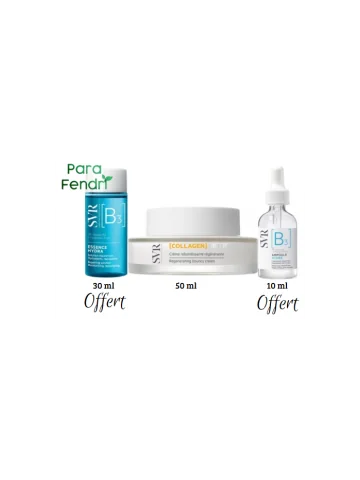 La Trousse Ma Routine Raffermissante SVR offre une hydratation intense et un soin anti-âge avec l'Essence Hydra B3 30 ml (offert), l'Ampoule Hydra B3 10ml (offerte) et la crème Collagen Biotic 50ml. Parfaite pour lisser, raffermir et illuminer toutes les peaux, même les plus sensibles.