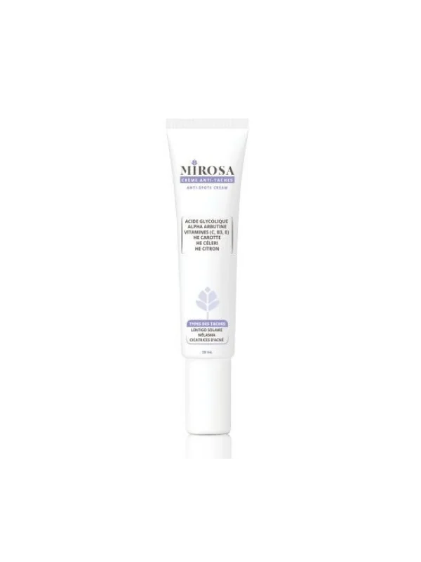 La Crème Anti-Taches Mirosa 20ml est un soin ciblé formulé pour traiter efficacement les taches pigmentaires. Grâce à ses ingrédients actifs éclaircissants, cette crème aide à réduire les taches brunes et à uniformiser le teint. Elle hydrate et revitalise la peau, offrant un éclat naturel et une peau visiblement plus lumineuse. Sa formule douce et efficace convient à tous les types de peau, même les plus sensibles.