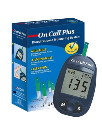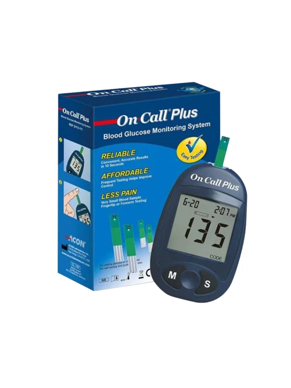 Le lecteur de glycémie On Call Plus est un appareil de mesure de la glycémie avec contrôle automatique du volume sanguin. Il fournit une lecture précise du taux de glucose à partir d’une goutte de sang appliquée sur une bandelette insérée dans le lecteur.