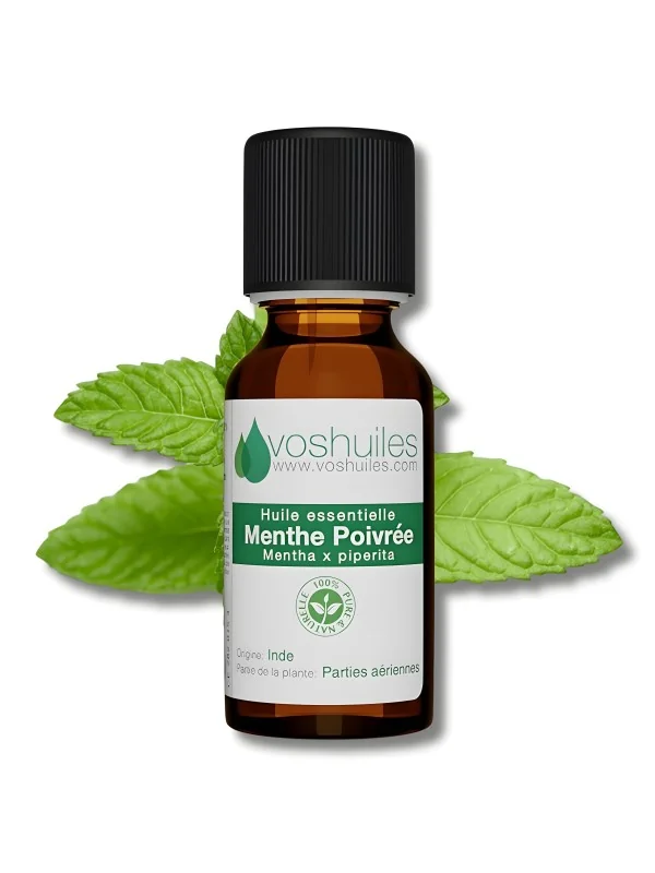 Huile essentielle de menthe poivrée 100% pure et naturelle, riche en menthol, obtenue par distillation à la vapeur des feuilles avant floraison.