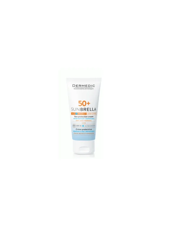 La Créme Solaire Dermedic Sunbrella Photostable et imperméable pour les peaux mixtes à grasses enrichie en Complexe de filtres UVA et UVB, Système de protection avancée, Extrait de romarin, Farfaraïde, Allantoïne, Glycérine, Eau thermale Cette Créme permet d'Offrir une protection efficace et durable contre les rayons UVA et UVB - SPF 50+, de calmer les irritations et l'inflammation séborrhéique Ne pas obstruer les pores Photostable et imperméable Hypoallergénique