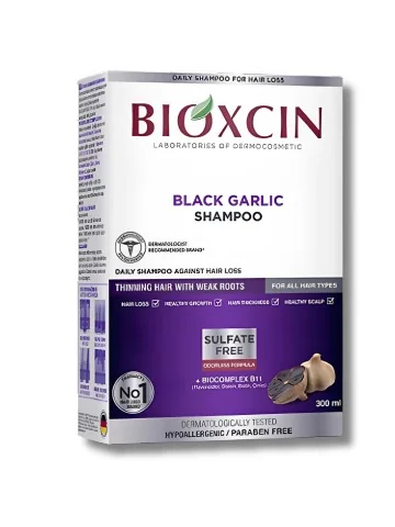 Bioxcin Black Garlic Shampooing anti-chute : formule au Biocomplex B11 et ail noir pour réduire la chute des cheveux, renforcer la fibre capillaire et améliorer volume et brillance.