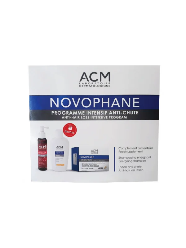 Coffret ACM Novophane anti-chute : programme intensif complet avec complément alimentaire, shampooing énergisant et lotion anti-chute pour freiner la chute et stimuler la repousse.