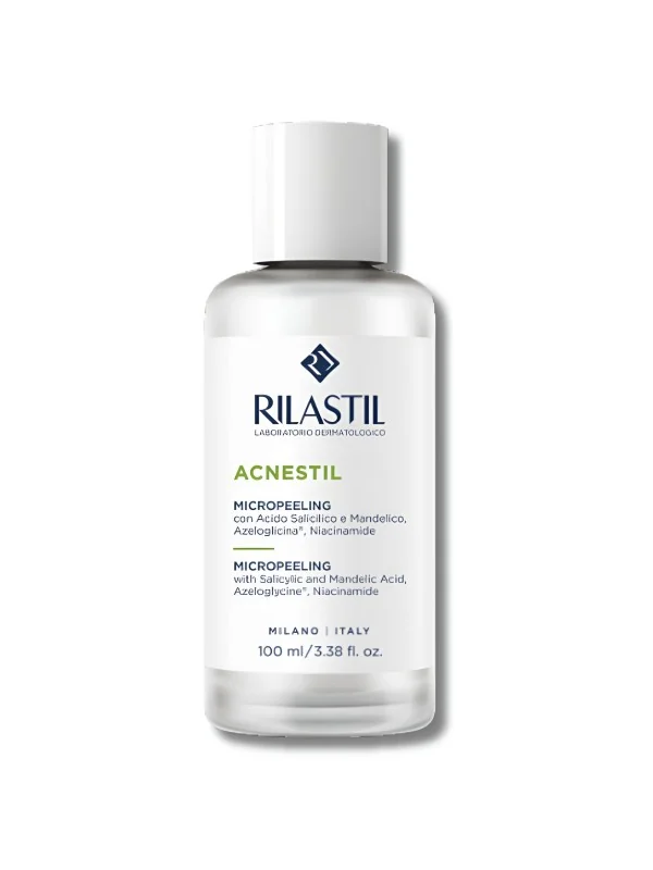 Le Rilastil Acnestil Micropeeling est une lotion exfoliante sans rinçage conçue pour purifier la peau à tendance acnéique. Formulée avec de puissants actifs comme l’acide salicylique, l’acide mandélique, l’azéloglycine et la niacinamide, elle agit efficacement pour réduire les imperfections, lisser la peau et normaliser le sébum, tout en respectant les peaux sensibles grâce à sa formule sans alcool.