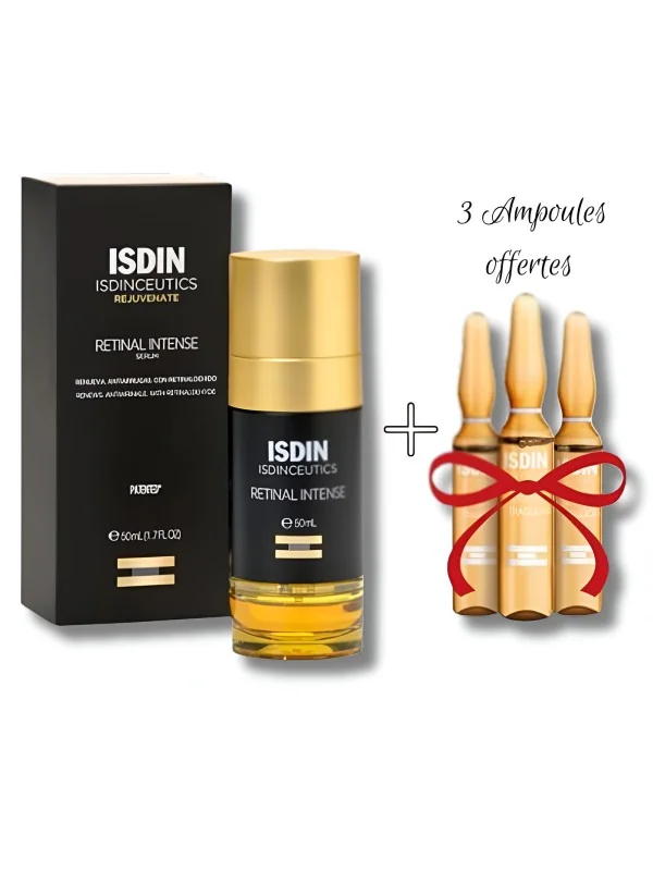 Le coffret ISDIN Retinal Intense associe un sérum de nuit au rétinaldéhyde et des ampoules antioxydantes pour une routine anti-âge complète, efficace contre les rides, la perte de fermeté et les signes de l’âge.