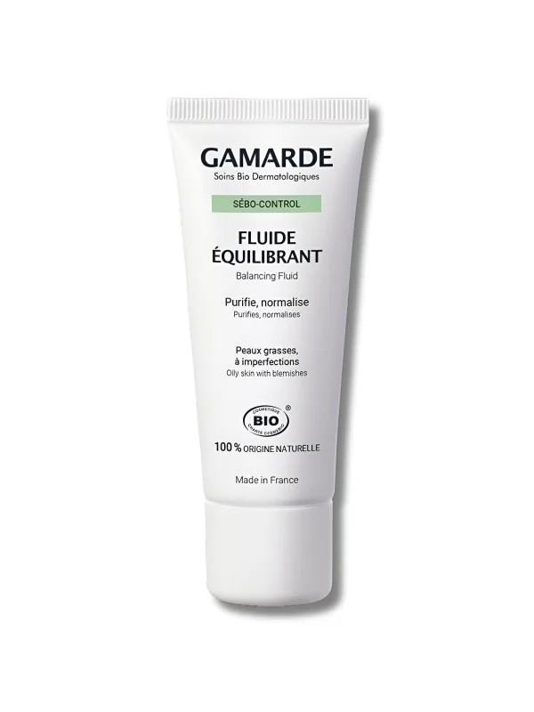 Fluide équilibrant enrichi en huiles essentielles pour purifier, tonifier et réguler les peaux grasses, à appliquer matin et soir.