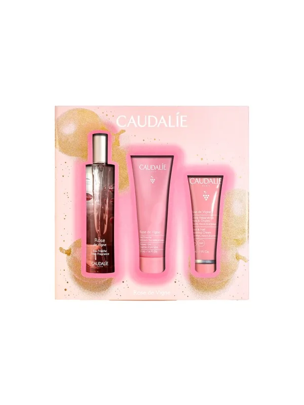 Coffret Caudalie Rose de Vignes réunissant une eau fraîche, un gel douche et une crème mains pour une routine parfumée, douce et nourrissante.