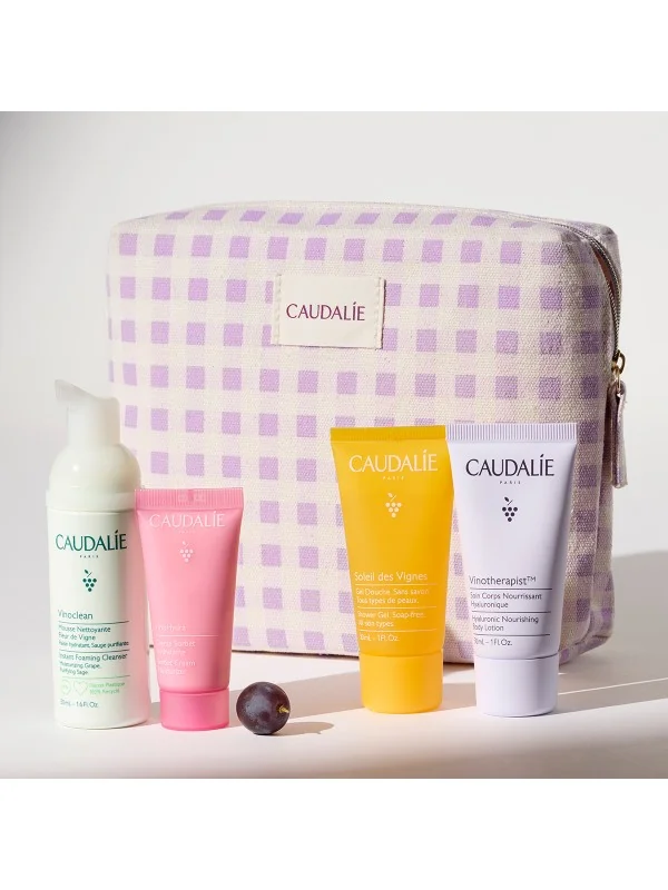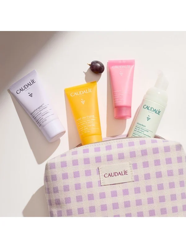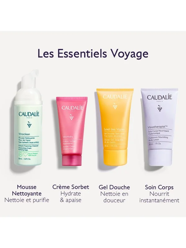 Découvrez notre trousse de voyage : Les Essentiels de Caudalie pour une peau toujours douce et hydratée, où que vous alliez. Cette nouvelle édition limitée contient 4 soins cultes Visages et Corps en format voyage : une Mousse Nettoyante Fleur de Vigne Vinoclean 50 ml, une Crème Sorbet Hydratante VinoHydra 15 ml, un Gel Douche Soleil des Vignes 30 ml et un Soin Corps Nourrissant Hyaluronique Vinotherapist 30 ml.
