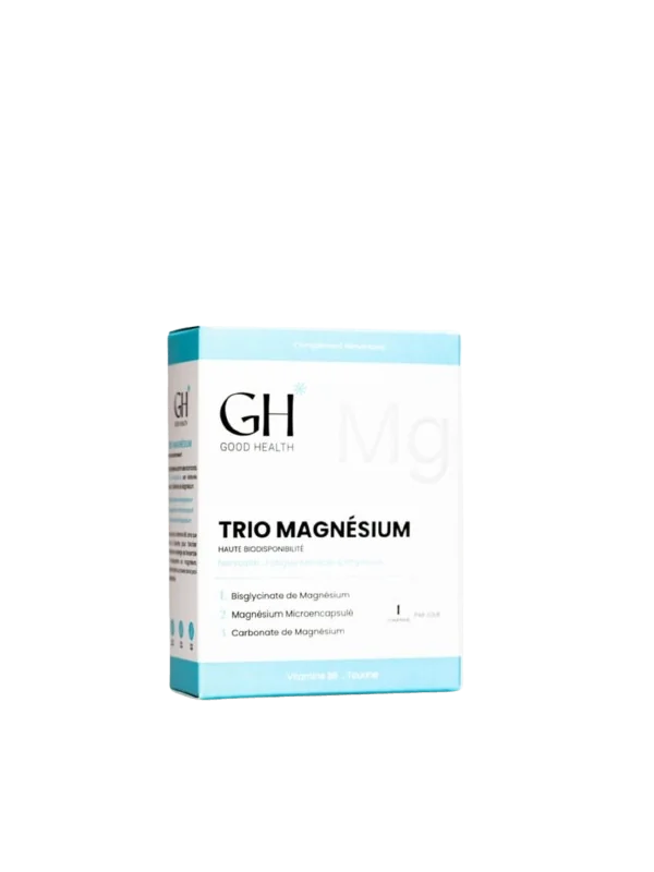 GH TRIO MAGNESIUM est un complément alimentaire conçu pour favoriser votre bien-être mental et physique. Chaque gélule contient un mélange de trois formes de magnésium : bisglycinate de magnésium, carbonate de magnésium et magnésium microencapsulé, assurant ainsi une haute biodisponibilité et une absorption optimale. GH TRIO MAGNÉSIUM est le choix idéal pour ceux qui souhaitent soutenir leur gestion du stress et améliorer leur vitalité au quotidien. Bienfaits : Nervosité : Aide à réduire le stress et à apaiser l'anxiété. Fatigue mentale et physique : Contribue à diminuer la fatigue et à améliorer la résistance au stress.