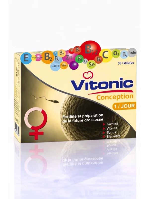 Vitonic Conception est un complément alimentaire spécialement formulé pour apporter les nutriments essentiels au soutien de la fertilité féminine. Chaque gélule associe vitamines (A, C, D, E, groupe B), minéraux (zinc, sélénium, magnésium, calcium), antioxydants et extraits de plantes comme la spiruline, la maca et la gelée royale.