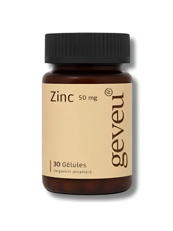 GEVEU Zinc est un complément alimentaire riche en zinc (50 mg), un minéral essentiel pour de nombreuses fonctions biologiques. Il soutient le système immunitaire, maintient une peau saine, renforce cheveux et ongles, et protège les cellules contre le stress oxydatif.