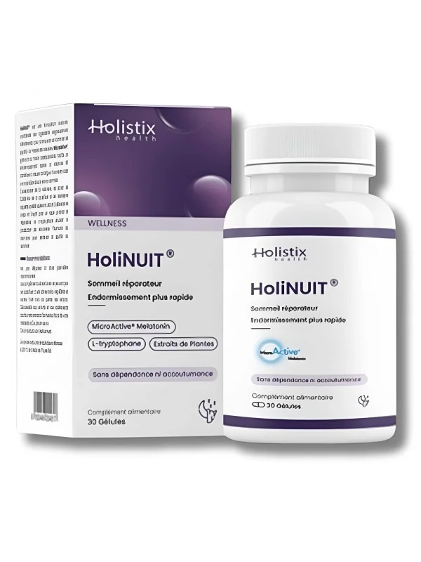HoliNUIT Holistix : mélatonine à libération prolongée qui facilite l’endormissement, limite les réveils nocturnes et favorise un sommeil naturel, réparateur et sans accoutumance.