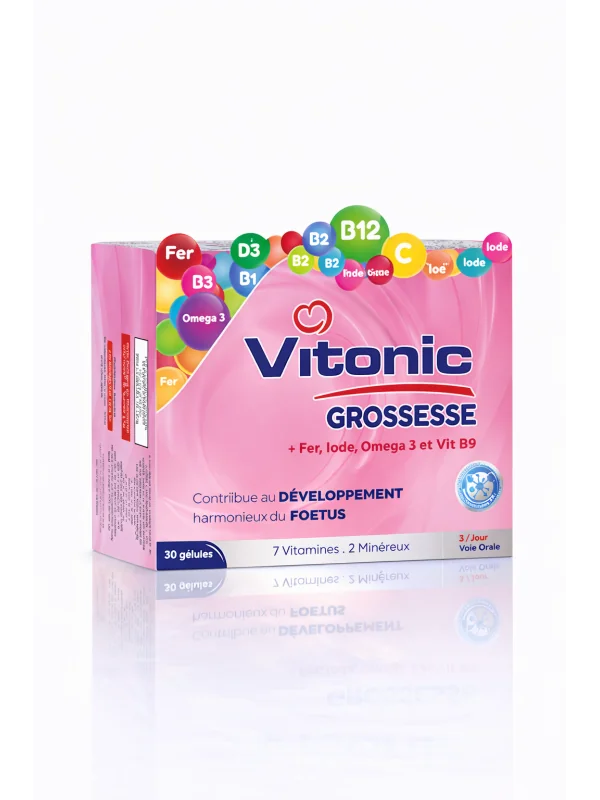 Vitonic Grossesse est un complément alimentaire en gélules spécialement formulé pour accompagner les besoins nutritionnels de la femme enceinte et soutenir le bon développement du fœtus. Sa formule complète associe vitamines C, D, E et du groupe B à des minéraux essentiels tels que le calcium, le magnésium, le zinc et le sélénium.