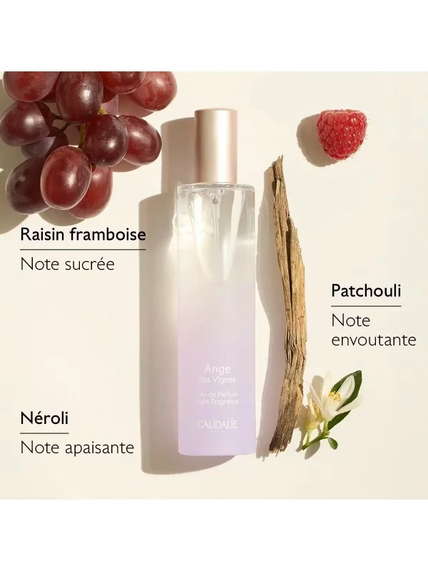 Avec Ange des Vignes, Caudalie signe sa première Eau de Parfum, à la fois voluptueuse et pétillante. Sa fragrance chyprée dévoile des notes fruitées de raisin framboise, légères de néroli et enveloppantes de patchouli. Entre ciel et vignes, une envolée céleste, envoûtante et sensuelle.