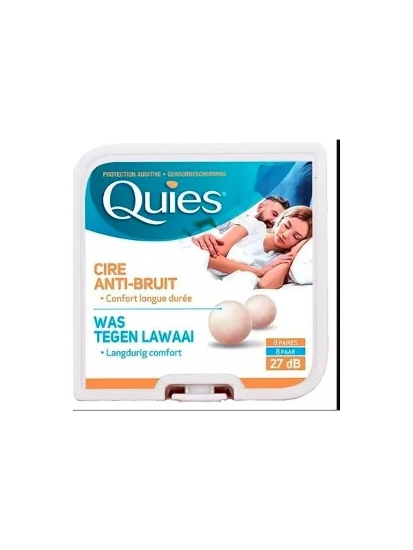 Quies Protection Auditive à la Cire Anti-Bruit 8 Paires protègent les oreilles du bruit en diminuant les nuisances sonores de 27 dB en moyenne. Ces bouchons anti-bruit sont malléables et s'adaptent ainsi à tous les conduits auditifs en offrant un excellent maintien dans l'oreille. En prenant la température du corps, ils se font totalement oublier. Grâce à leur composition unique, ces protections auditives en cire assurent confort et efficacité, et sont idéales pour les utilisations prolongées (dormir, se reposer, étudier…). Discrètes, elles peuvent être utilisées lors de séances de méditation ou pour se concentrer. Elles protègent des agressions sonores, sans vous couper totalement de votre environnement.