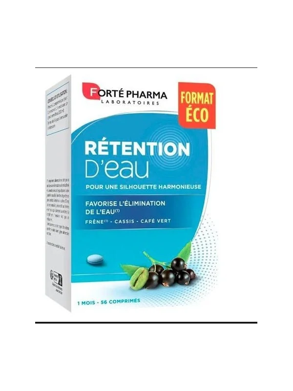 FORTÉ PHARMA Rétention d'eau Pour une silhouette harmonieuse Favorise l'élimination de l'eau Frêne - Cassis - Café vert Complément alimentaire 56 comprimés Poids net : 50g Rétention dEau de Forté Pharma est un complément alimentaire minceur qui aide à affiner la silhouette en activant l'élimination de l'eau grâce au Frêne. Rétention d'Eau contribue également à apporter des vitamines et minéraux qui aide à revitaliser l'organisme. Prendre 2 comprimés par jour: 1 le matin et 1 le midi avec un verre d'eau. Format de 4 semaines, à renouveler si nécessaire