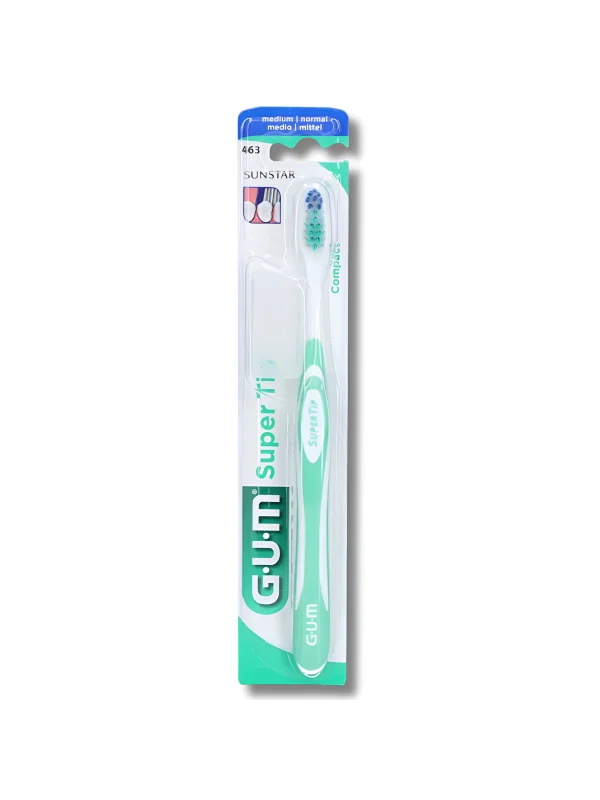 La brosse à dents GUM SuperTip Médium 463 assure un nettoyage complet et doux grâce à ses brins multi-niveaux et son manche ergonomique.
