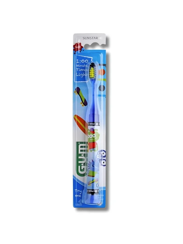 Brosse à dents lumineuse GUM 903 pour enfants 7+, conçue pour un brossage efficace, doux et ludique grâce à sa minuterie intégrée de 1 minute.