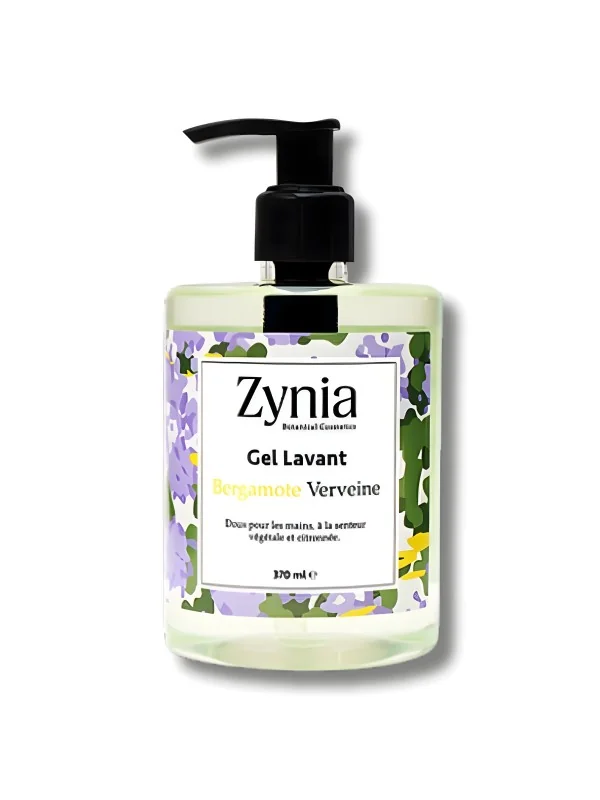 Gel lavant mains ZYNIA au parfum Bergamote Verveine, nettoie et hydrate en douceur. Idéal pour toute la famille. Format 370ML.