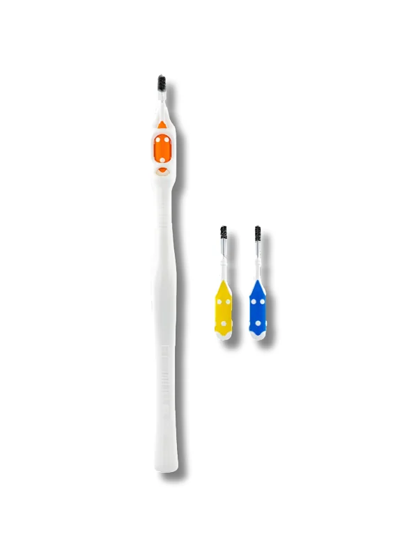 Soies bicolores : Les soies blanches indiquent les gencives sensibles en cas de saignement, tandis que les poils noirs, plus fins, facilitent l'insertion dans l'espace interdentaire et rendent la plaque visible.