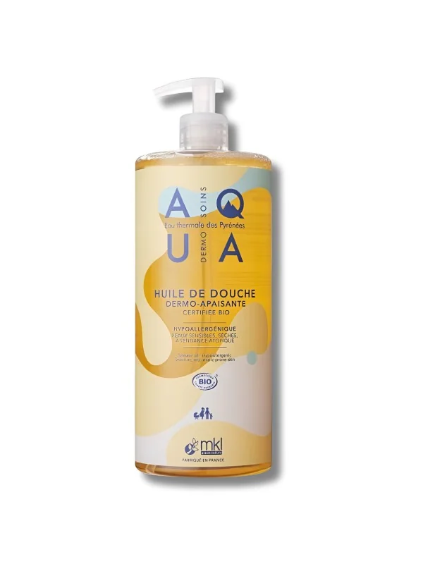 MKL Green Nature Aqua Huile de Douche Dermo-Apaisante Bio 1 L est une huile de douche sans savon qui nettoie en douceur les peaux sensibles, sèches et à tendance atopique de toute la famille, dès la naissance.