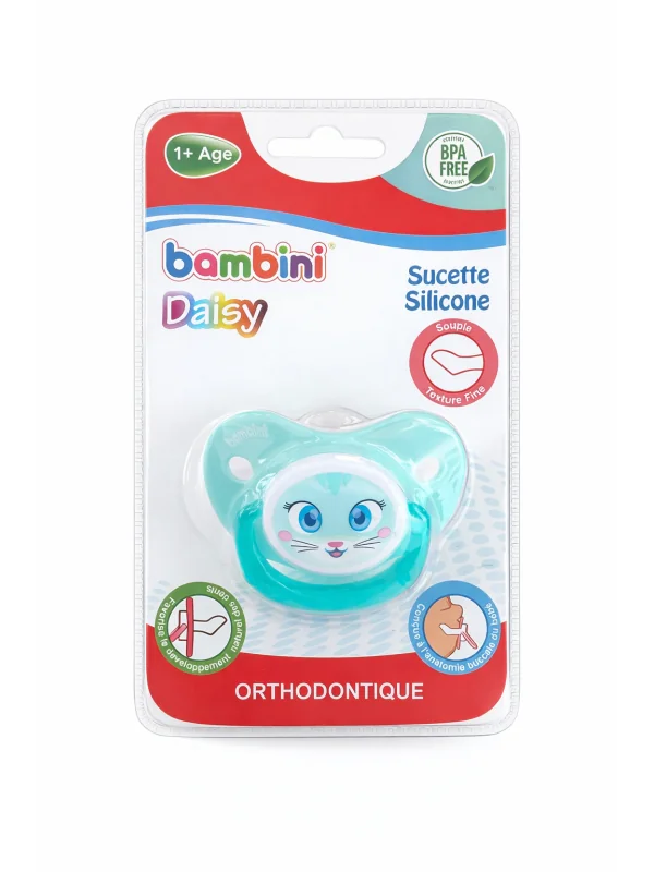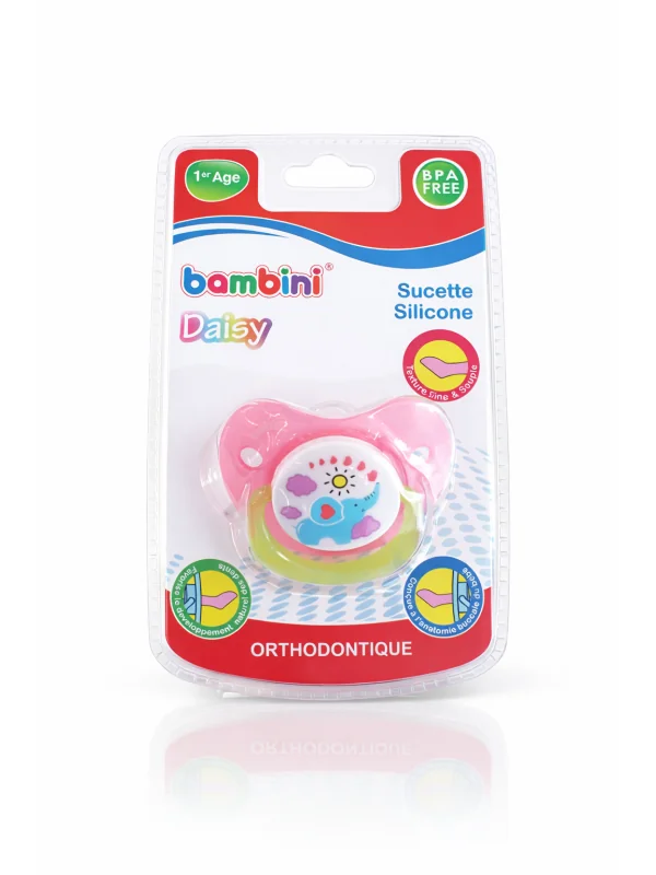 Sucette orthodontique Bambini Daizy en silicone souple sans BPA, conçue pour une succion naturelle et confortable tout en favorisant le bon développement bucco-dentaire de bébé.