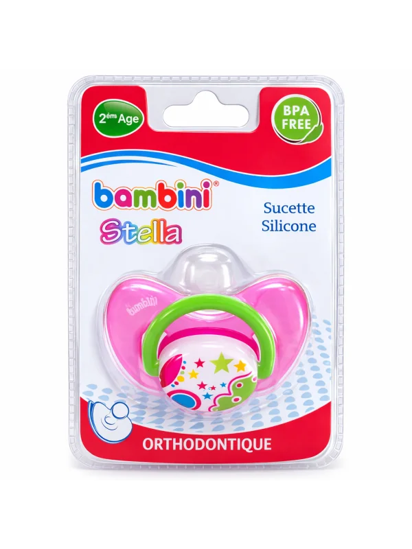 Sucette orthodontique Bambini Stella 2ᵉ âge en silicone souple sans BPA, conçue pour offrir confort, sécurité et succion naturelle aux bébés de 6 à 18 mois.