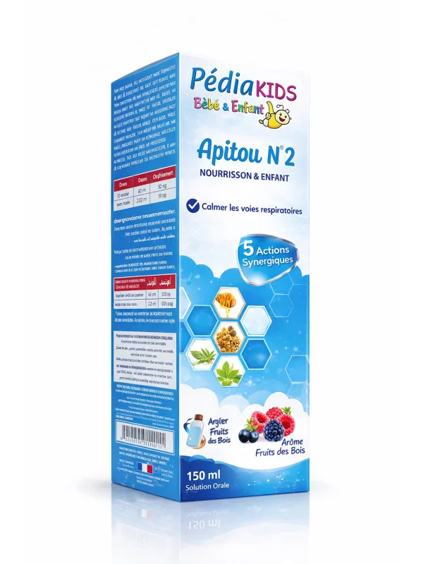Pédiakids APITOU n°2 aide à renforcer naturellement les défenses immunitaires des enfants grâce à une formule riche en actifs naturels.
