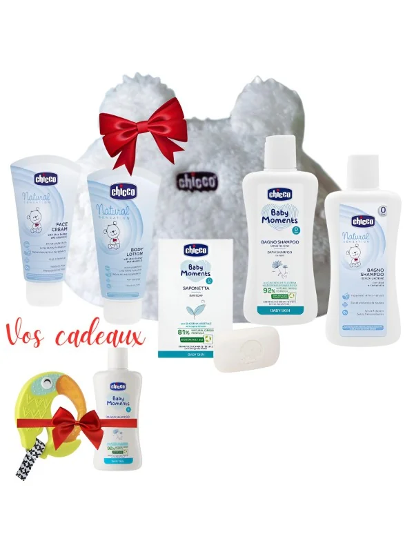 Le Pack Chicco Baby Moments inclut 7 essentiels pour bébé : Natural Sensation Bain Shampoing 200ml, Crème de Visage Natural Sensation 50 ml, Natural Sensation Lait de corps 150ml, Shampoing baby moment 200 ml, Savon Baby Moments 100 gr, Shampoing 2 en 1 baby moment 200 ml (offert) et ANNEAU DE DENTITION TOUCAN (offert)