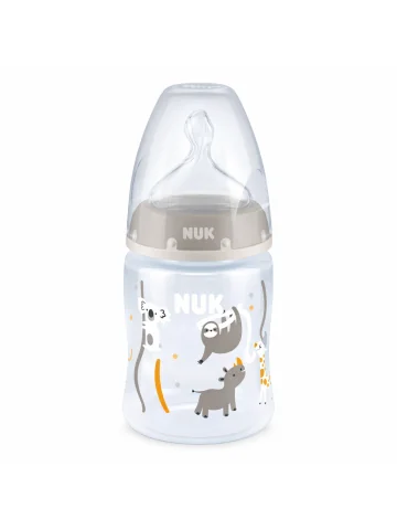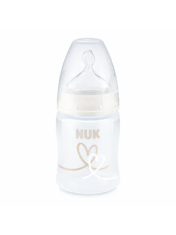 Biberon NUK 0-6 mois avec tétine silicone anti-coliques, indicateur de température et conception sans BPA pour une alimentation sûre et confortable.