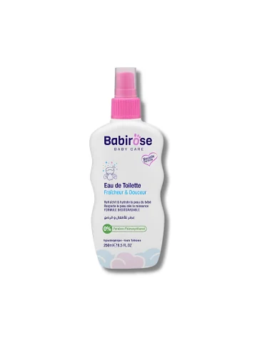 Babirose Eau de Toilette offre un parfum doux, sans alcool, testé microbiologiquement et respectueux de la peau de votre bébé, pour une fraîcheur durable