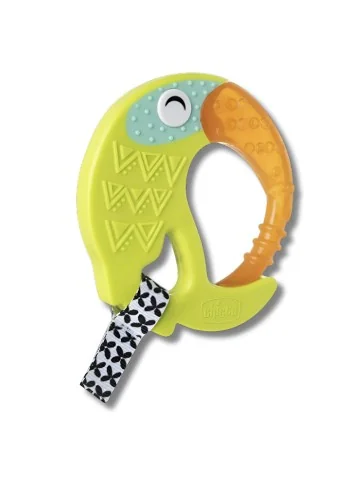 L'anneau de dentition Tucano Chicco, en forme de toucan, soulage les gencives de bébé grâce à son effet rafraîchissant et sa texture stimulante, tout en étant facile à saisir pour les petites mains.