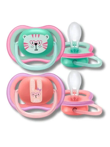 00Lot de 2 sucettes Avent Ultra Air 18M+ pour fille, avec tétine orthodontique, design respirant et sans BPA, pour un confort et une hygiène optimale.