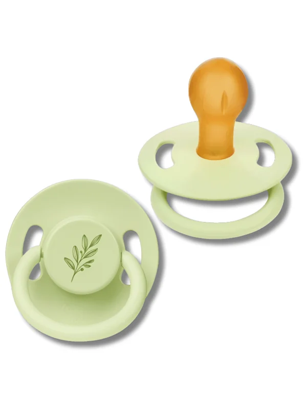 Tétine bébé en caoutchouc 100 % naturel, avec pointe arrondie, bouclier ventilé, structure incurvée, sans BPA et facile à stériliser.