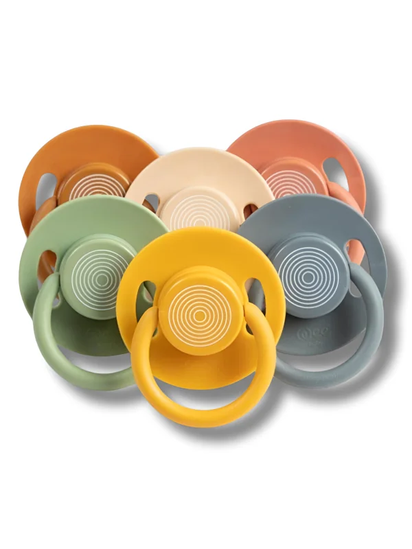 Tétine bébé en silicone avec extrémité ronde imitant le sein, bouclier ventilé anti-irritations, structure incurvée et embout doux sécurisé.