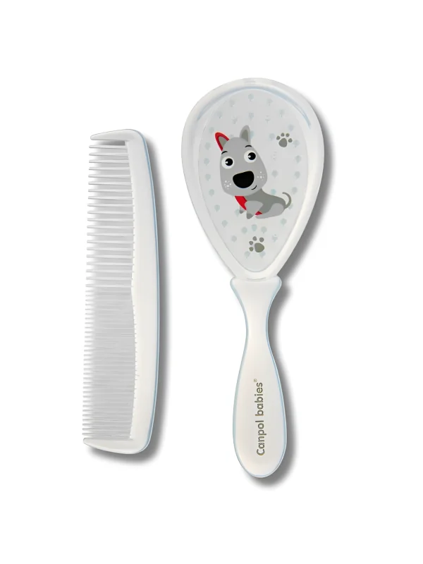 Ensemble peigne et brosse Canpol Babies : soin doux pour cheveux fins et cuir chevelu délicat, avec brosse à poils naturels et peigne à dents fines et grossières.