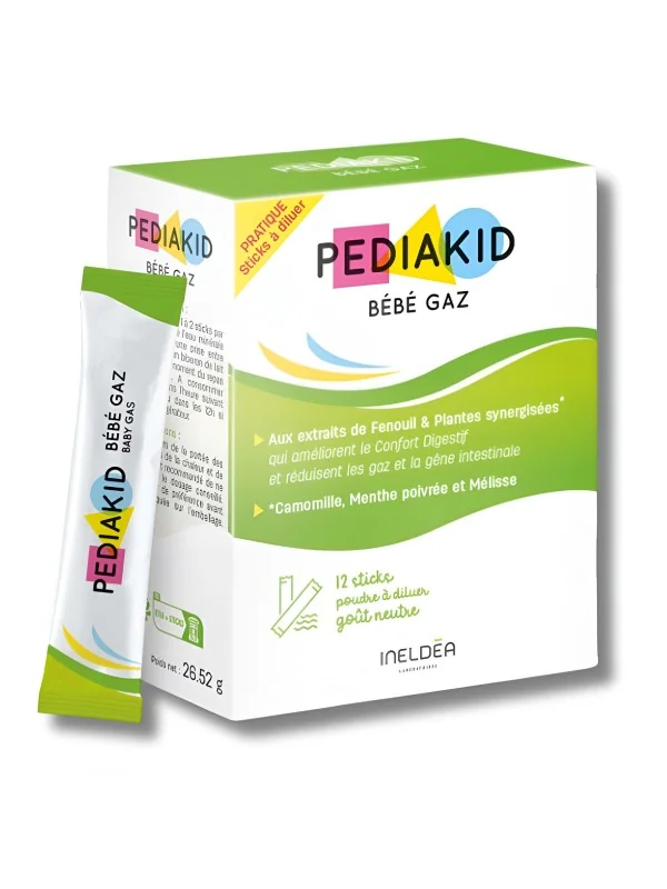 Pediakid Bébé Gaz 12 Sticks est une préparation pour boisson à base d’extraits naturels de plantes, spécialement conçue pour les bébés.