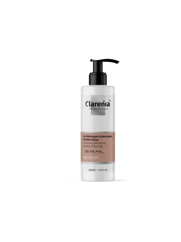 CLARENIA© GEL NETTOYANT ECLAIRCISSANT DOUBLE ACTION élimine les impuretés et l'excès de sébum et corrige les troubles de pigmentation. Grâce à ses actifs 100% naturels, la peau est parfaitement nettoyée, fraîche et douce. Le teint parait plus clair et plus unifié. La peau retrouve une luminosité parfaite. Avec sa haute teneur en agents hydratants ce nettoyant à base de savon ne fait pas sécher la peau. Résultat : au fil des applications la peau retrouve son éclat.