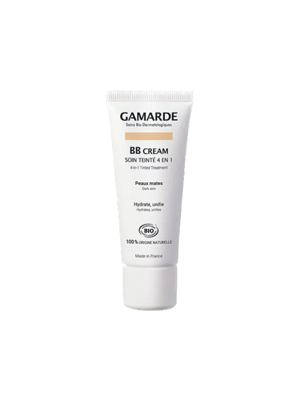 GAMARDE BB Cream Peaux Mates 40ML GAMARDE BB Cream Peaux Mates Dark est un soin correcteur teinté 4 en 1. GAMARDE BB Cream dark révèle l’éclat des peaux mates pour un résultat naturel, uniforme et éclatant. Elle protège la peau des agressions extérieures grâce à l’action de l’Eau Thermale de Gamarde-les-Bains et de l’huile d’Argan bio. Multi-actions, elle hydrate, unifie, illumine et protège. Fluide et non grasse, la BB Cream Peaux Claire contient des actifs aux propriétés apaisantes et matifiantes.
