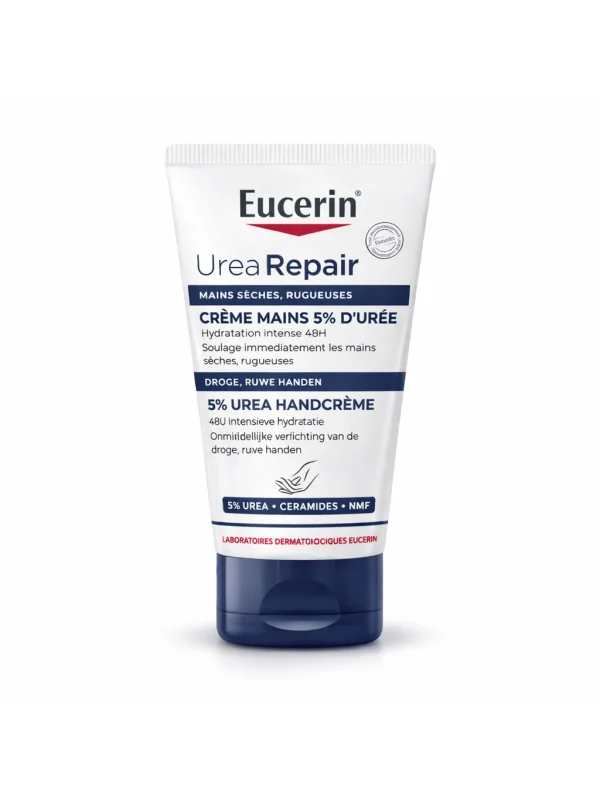 Eucerin Urea Repair Plus Crème Mains 5% Urée hydrate intensément, répare les mains sèches et laisse la peau douce sans effet gras.