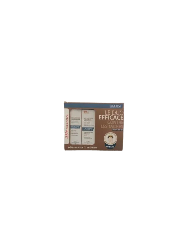 Ducray Melascreen Pack : corrige les taches, hydrate intensément et protège la peau avec une protection solaire SPF50+ offerte.