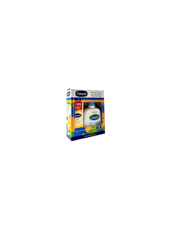 Cetaphil Coffret Sun Face Fluid Teinte SPF50+ + CETAPHIL LOTION NETTOYANTE 236ML Ce coffret se compose de : Cetaphil Coffret Sun Face Fluid Teinte SPF50+ : Cetaphil Sun Face Fluid Teinte SPF 50 est un Multi Protection Fluide régulateur qui offre une protection fiable contre la pollution atmosphérique et convient à la protection solaire quotidienne du visage. La texture ultra-légère de Cetaphil Sun Face Fluid pénètre immédiatement et procure une hydratation intense tout en ayant un effet matifiant longue durée. Le filtre UV photostable et la technologie spéciale Celligent offrent une protection UVA et UVB hautement efficace et immédiate, une protection efficace des cellules et de l'ADN et préviennent le photovieillissement. CETAPHIL LOTION NETTOYANTE 236ML : Cetaphil La lotion nettoyante élimine les impuretés, le maquillage et l’excès de sébum sans l’assécher. Sa formule haute tolérance est sans savon et sans parfum. De par sa formule douce, il n’est pas nécessaire de rincer CETAPHIL LOTION NETTOYANTE est riche en émollients et humectants pour apporter à la peau tout ce dont elle a besoin.