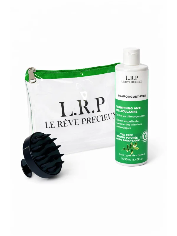 Shampoing anti-pelliculaire LRP efficace contre les pellicules, accompagné d’une brosse de massage et d’une trousse de toilette offertes pour une routine complète du cuir chevelu.
