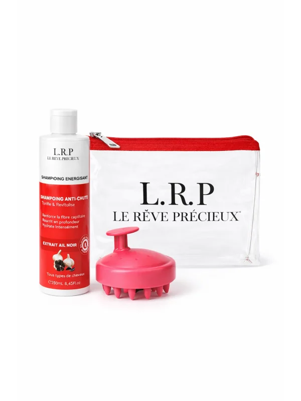 Ce pack avantage comprend également une brosse de massage pour activer la microcirculation du cuir chevelu et optimiser l’efficacité du shampoing, ainsi qu’une trousse de toilette offerte, pratique pour un usage quotidien ou en déplacement.