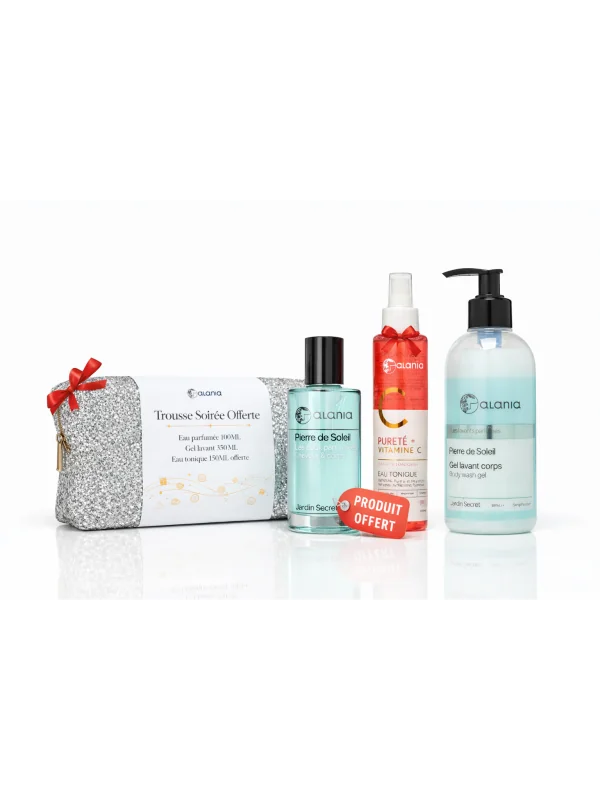 ALANIA PIERRE DE SOLEIL - GEL LAVANT CORPS 350ML+EAU PARFUMEE 100 ML+EAU TONIQUE 150ML ET TROUSSE OFFERTES