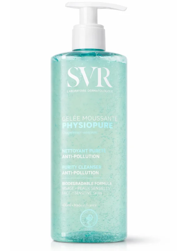 SVR Physiopure Gelée Moussante nettoie et purifie efficacement toutes les peaux, même sensibles, sans les dessécher. Sa texture gel se transforme en une mousse onctueuse qui élimine les impuretés, la pollution et les traces de maquillage, même waterproof. La peau est parfaitement nette, fraîche et purifiée pour un moment de nettoyage à la fois efficace et agréable.