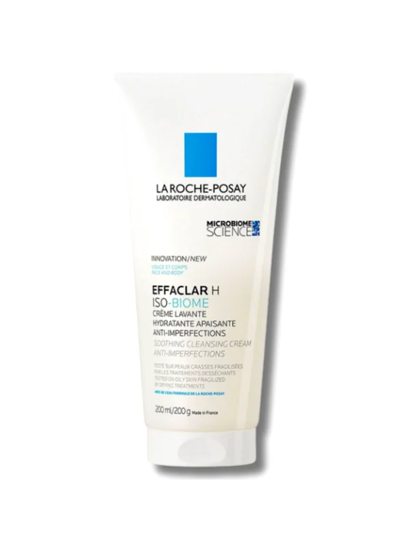 Effaclar H ISO-BIOME Crème Lavante Hydratante Apaisante Anti-Imperfections de La Roche-Posay est un nettoyant visage spécialement conçu pour les peaux sèches, fragilisées et sensibilisées par les traitements contre l’acné sévère.