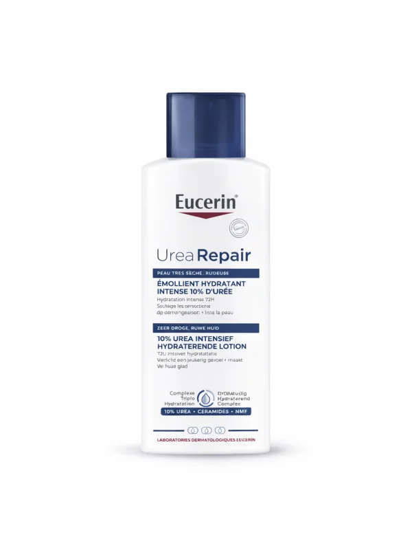Eucerin Urea Repair Plus 10% hydrate intensément, répare la barrière cutanée et apaise durablement les peaux sèches à très sèches.