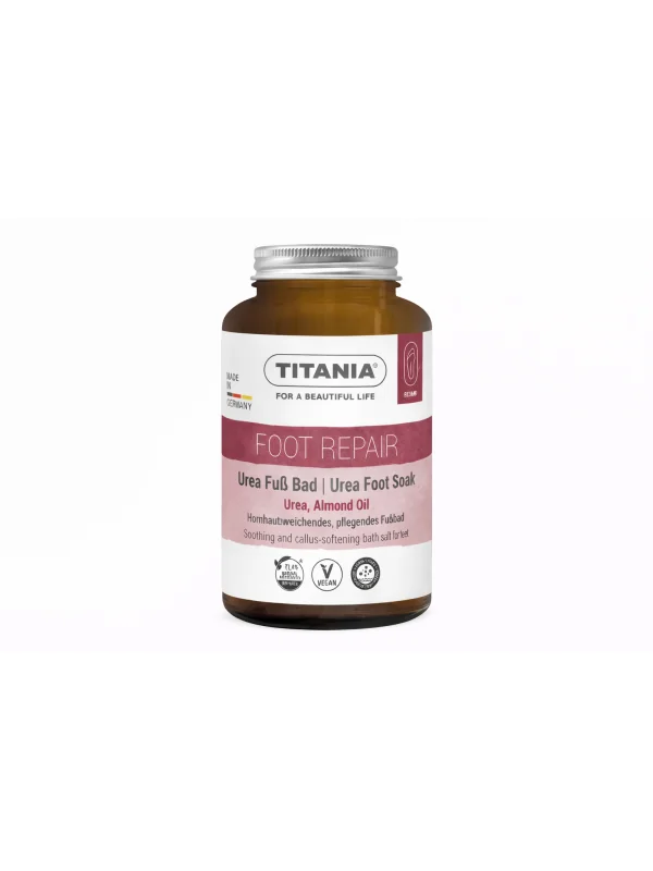 Titania Bain de Pieds à l’Urée ramollit les callosités, nettoie la peau en profondeur et offre une sensation de détente pour des pieds doux et rafraîchis.